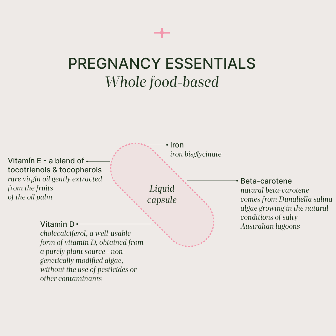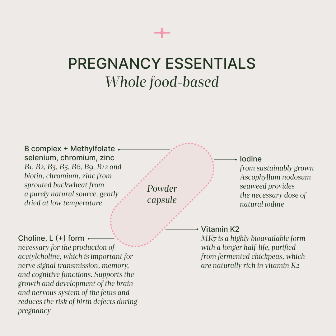 Complesso per la gravidanza a base di alimenti integrali contenente nutrienti essenziali per un supporto completo a mamma e bambino durante la gravidanza e l'allattamento